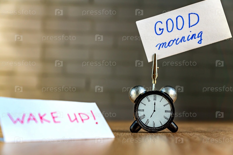 Будильник и баннер с рукописной фразой "доброе утро" на деревянном столе. Концепция тайм-менеджмента
