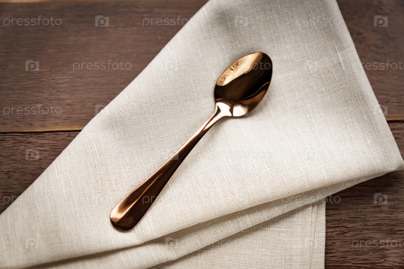 Закройте текстильную бежевую салфетку и подайте чайную ложку на деревянном столе