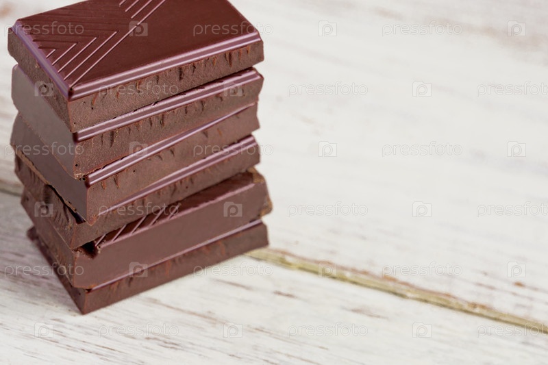 Шоколадные батончики на деревянном столе. Разбитые кусочки темного шоколада. Продовольственный фон