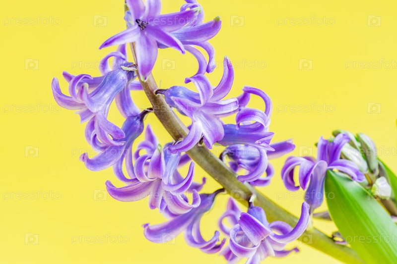 Закройте цветок цветущего голубого гиацинта на желтом фоне