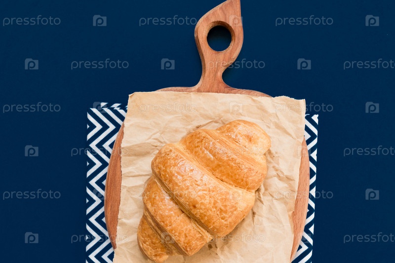 Вид сверху на круассан на разделочной доске и крафт-бумаге на синем фоне с копировальным пространством