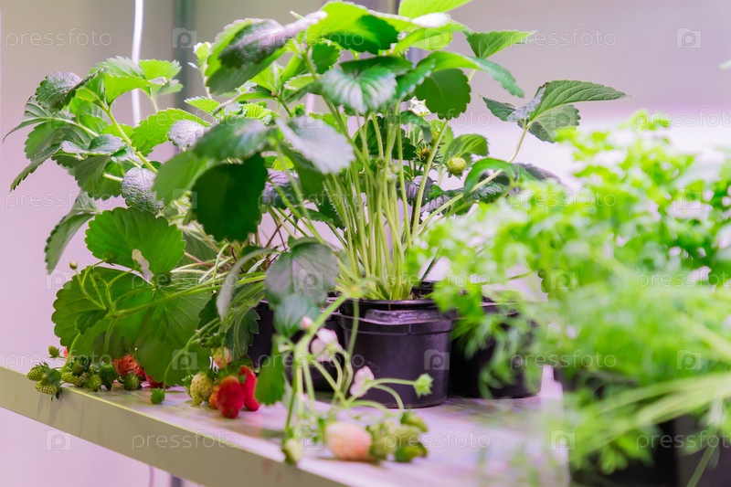 Сад дома. Цветущая клубника в цветочном горшке на полке