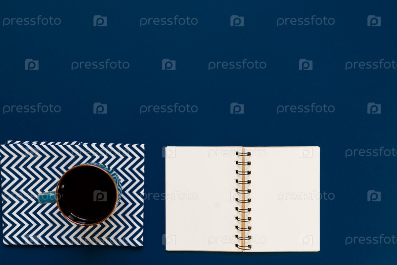 Вид сверху на чашку черного кофе и чистую тетрадь на синем фоне с копировальным пространством
