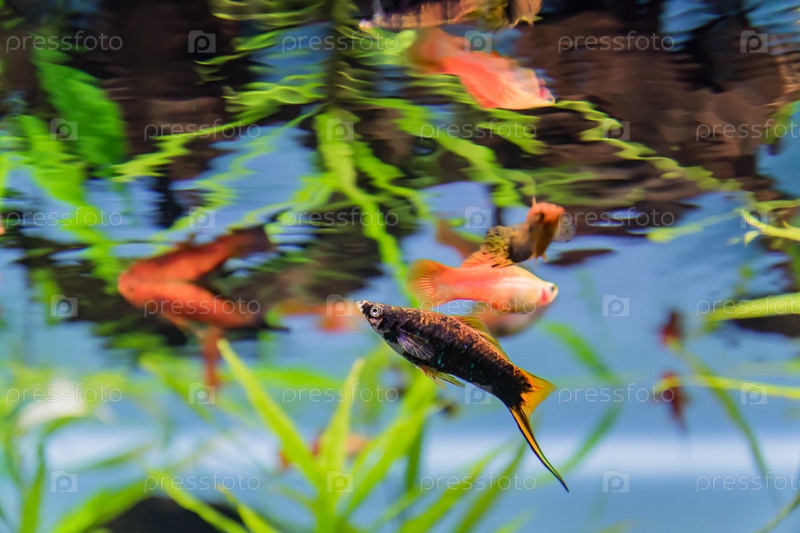 Красочные экзотические рыбы через окно аквариума