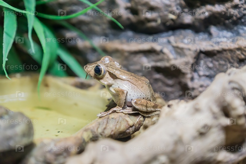 Ушная лягушка Борнео (Polypedates otilophus) сидит на дереве. крупный план
