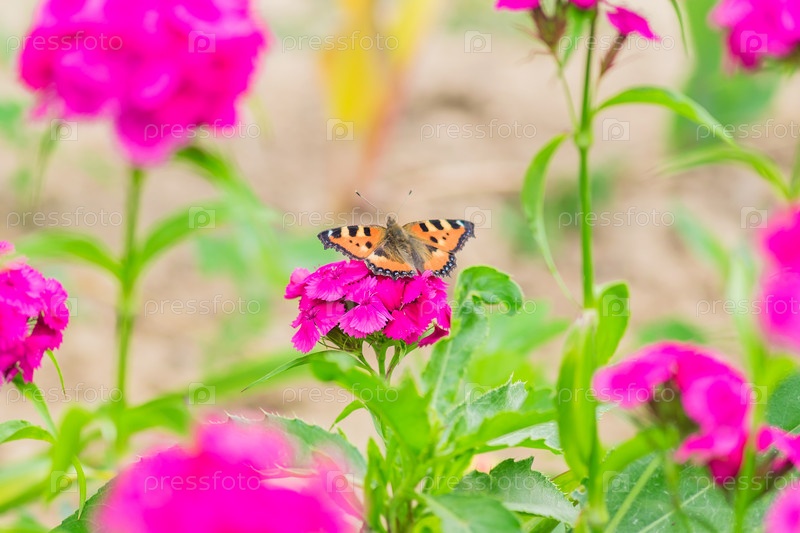Бабочка сидит на цветущем розовом флоксе