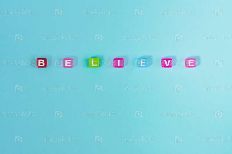 Поверьте надпись из разноцветных кубических бусин с буквами. Праздничная концепция синего фона с копировальным пространством