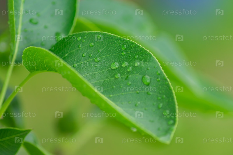 Закройте листья вишневого дерева после дождя. Зеленый фон листвы. Капли воды на листе