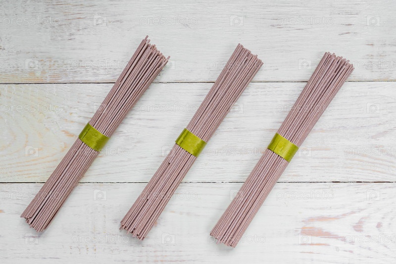 Сырая лапша соба на белом деревянном столе. Традиционная японская еда. Вид сверху, пространство для копирования