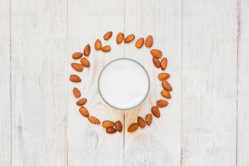 Вид сверху на домашнее миндальное молоко в стакане и разбросанные орехи на деревянном фоне. Тонированный. копировать пространство