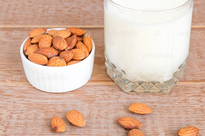 Домашнее миндальное молоко в стакане и орехи в белой фарфоровой миске на деревянном фоне