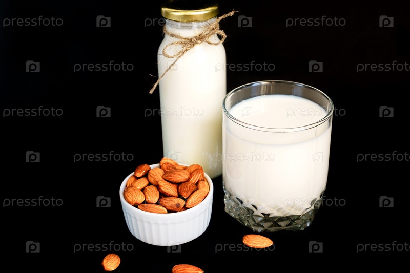 Домашнее миндальное молоко в бутылке и стакан с орехами в белой фарфоровой миске на черном фоне