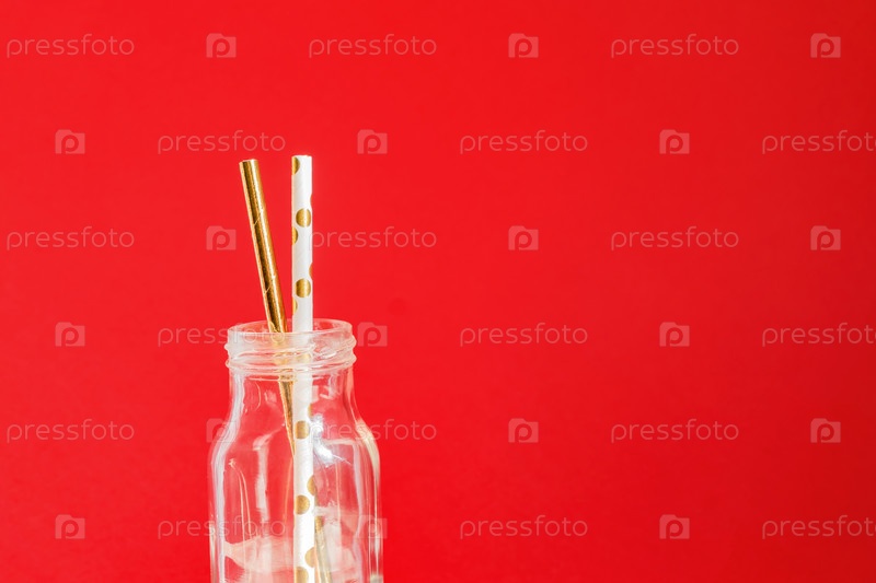 Ноль отходов. Бумажные перерабатываемые соломинки для коктейлей в стеклянной винтажной бутылке на красном фоне