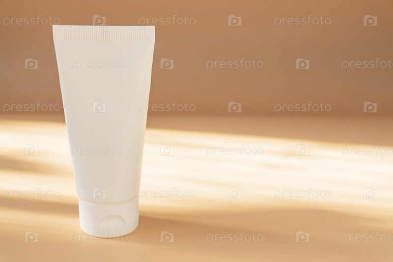 Пластиковая белая трубка на бежевом фоне с солнечными лучами. Очищающая косметика по уходу за кожей. Концепция красоты для ухода за телом лица