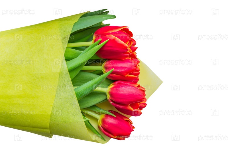 Букет красных тюльпанов в желтой оберточной бумаге на белом фоне