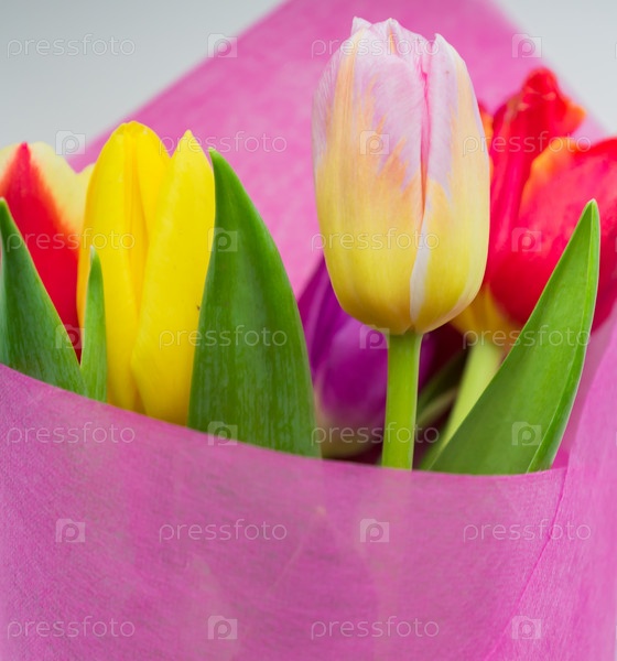 Красивый весенний букет из разноцветных тюльпанов. Крупным планом, мягкий фокус