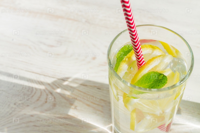 Стакан домашнего лимонада с лимонами, мятой и бумажной соломкой на деревянном деревенском фоне. Летний освежающий напиток