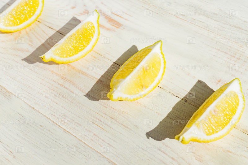 Закройте четверть лимонов на деревянном столе. Жесткие тени в солнечный день