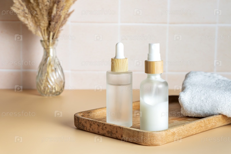 Белая бутылка-капельница из матового стекла и помповая бутылка крема для лица с бамбуковой крышкой на фоне ванной комнаты для презентации продукта. Косметика по уходу за кожей. Концепция красоты для ухода за лицом и телом