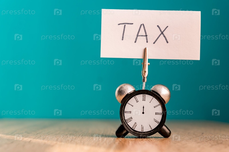Концепция напоминания о налоговом дне. будильник с баннером и рукописным словом "налог" на деревянном столе