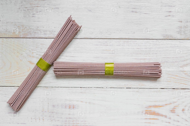 Сырая лапша соба на белом деревянном столе. Традиционная японская еда. Вид сверху, пространство для копирования