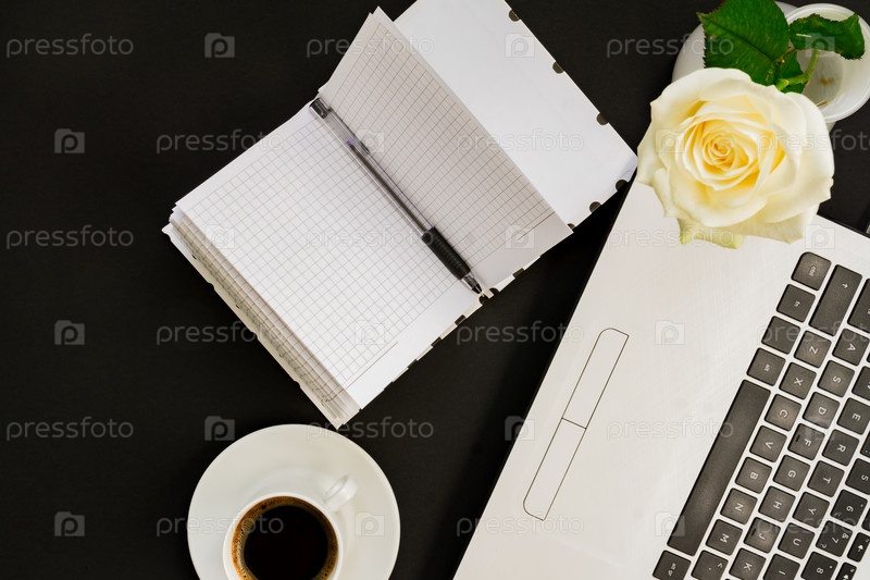 Плоская планировка, вид сверху на офисный стол. Рабочее место с ноутбуком, белой розой, открытым дневником и кофейной кружкой на черном фоне