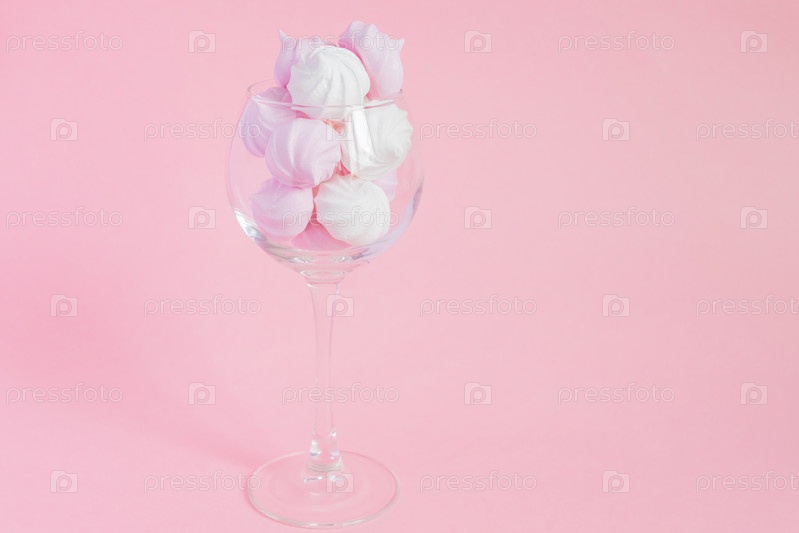 Белые и розовые витые безе в бокале на розовом фоне. Французский десерт, приготовленный из взбитых с сахаром и запеченных яичных белков. Открытка с копией пространства