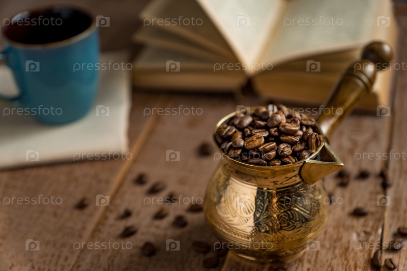 Свежие жареные кофейные зерна в джезве (традиционный турецкий кофейник) открыли книгу и чашку на деревянном столе