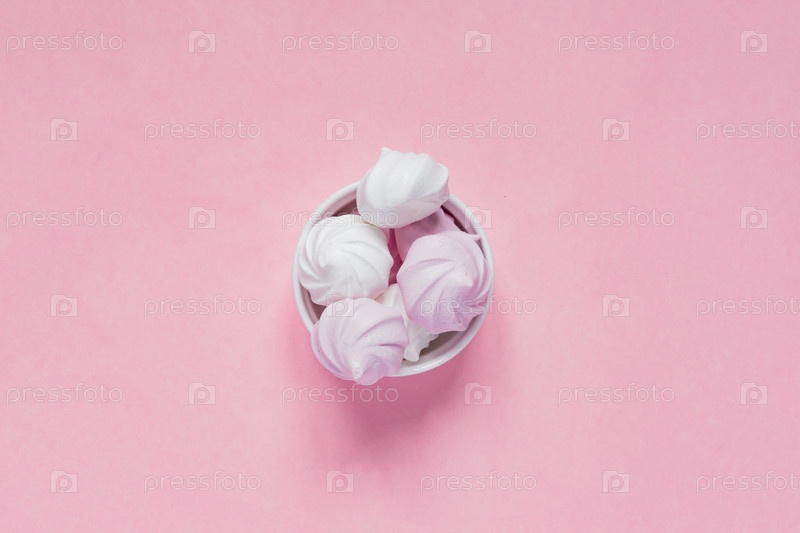 Вид сверху на белые и розовые скрученные безе в фарфоровой миске на розовом фоне, поздравительная открытка, пространство для копирования
