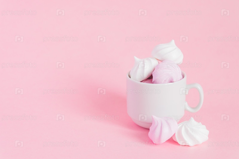 Белые и розовые витые безе в маленькой фарфоровой кофейной чашке на розовом фоне. Французский десерт, приготовленный из взбитых с сахаром и запеченных яичных белков. Открытка с копией пространства