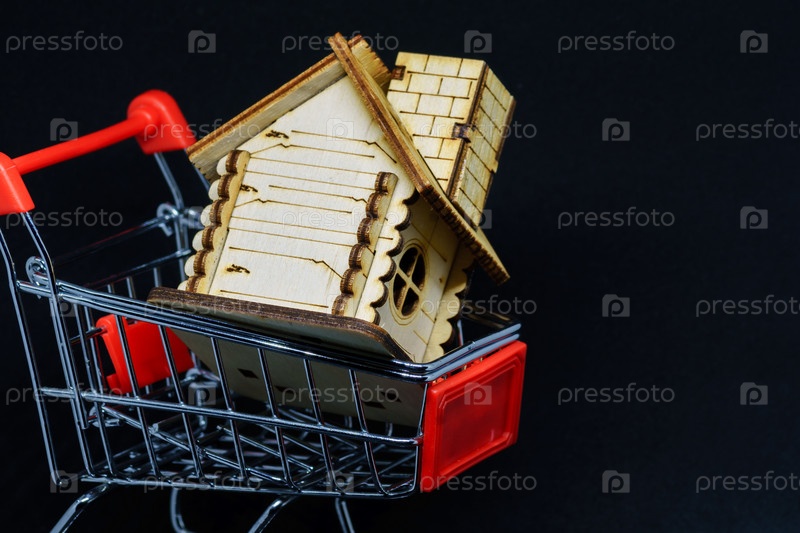 Деревянный дом в тележке для игрушек. Недвижимость и финансовая концепция