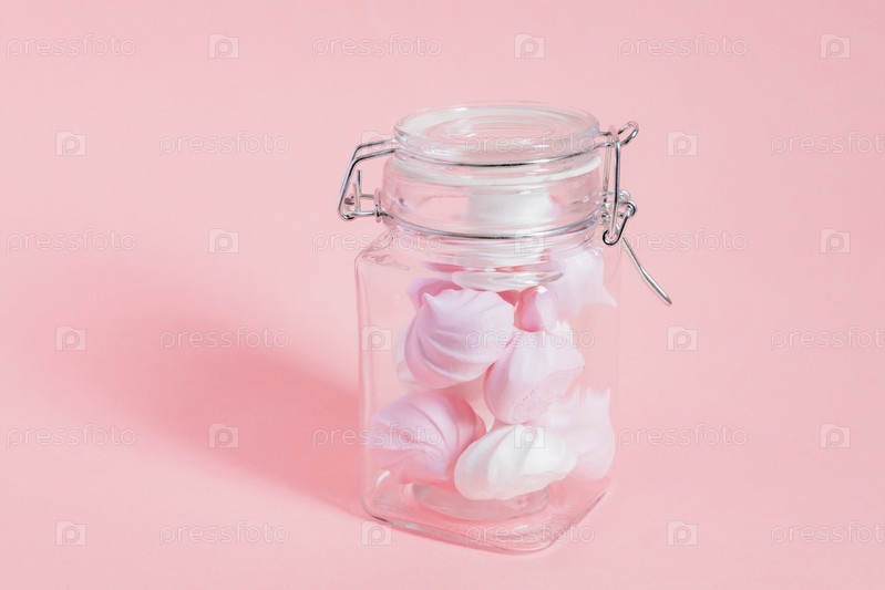 Белые и розовые витые безе в стеклянной банке на розовом фоне. Французский десерт, приготовленный из взбитых с сахаром и запеченных яичных белков. Открытка с копией пространства