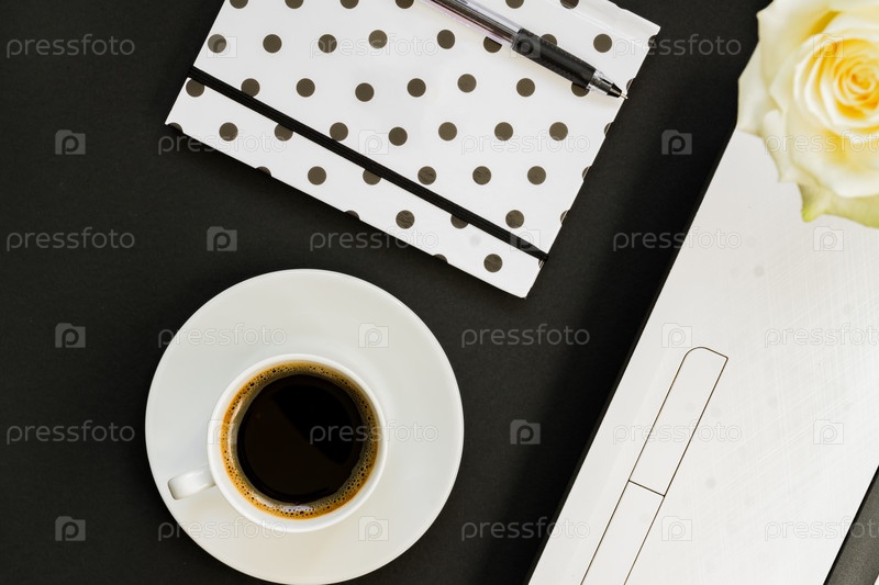Чашка черного кофе, блокнот и белая роза на черном фоне, вид сверху, пространство для копирования