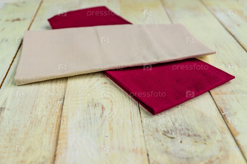 Вид в перспективе тканевых салфеток бежевого и бордового цветов на деревенском белом деревянном столе. Малая глубина резкости
