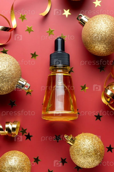 Вид сверху на эфирное масло для лица с натуральными ингредиентами на красном фоне с растяжками. Новогодние или рождественские подарки по уходу за кожей и косметика