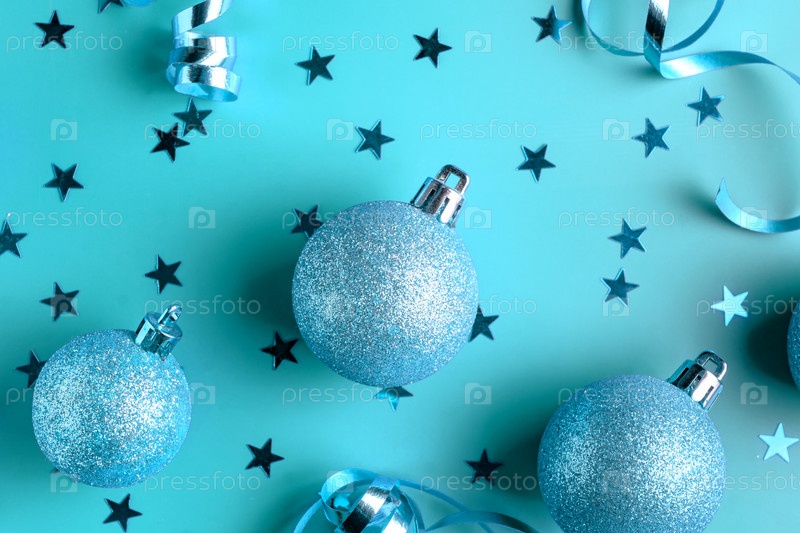 Новогодняя рамка из блестящих золотых безделушек, звезд, растяжек. Вид сверху на синем фоне. Тонированное изображение