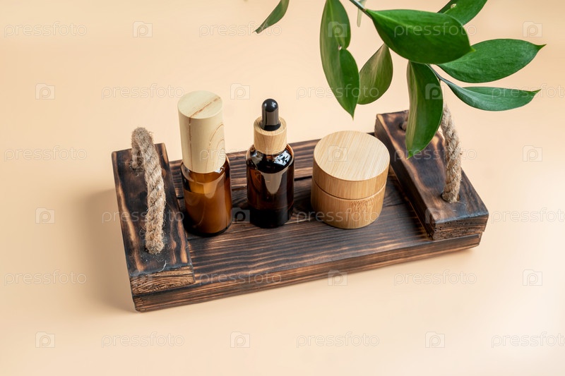 Эфирное масло или сыворотка для лица, банка жидкости и крема с бамбуковой крышкой, упаковывающая на деревянном подносе на бежевом фоне. Косметический продукт красоты для концепции ухода за кожей. Минимализм