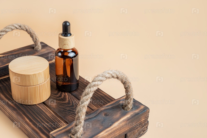 Мокет брендинга косметики SPA. Косметические бутылки и банки из темного стекла на деревянной подносе на бежевом фоне с копировальным пространством. Концепция натуральных органических косметических продуктов, стиль минимализма