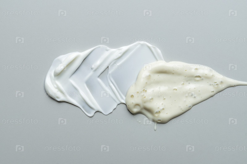 Различные косметические кремы, сыворотка и лосьон смазываются на сером фоне. Текстура красоты. Образец косметического продукта