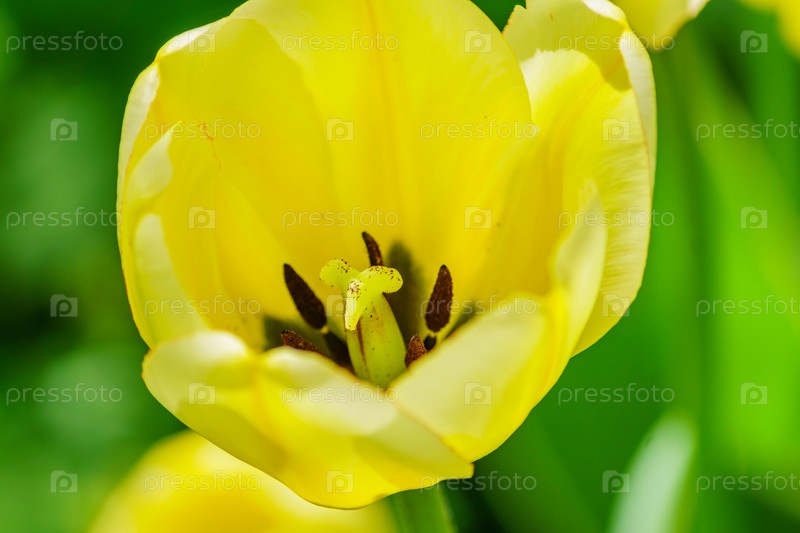 Закройте желтый тюльпан на зеленом фоне. Цветочный фон. Пейзаж летнего сада