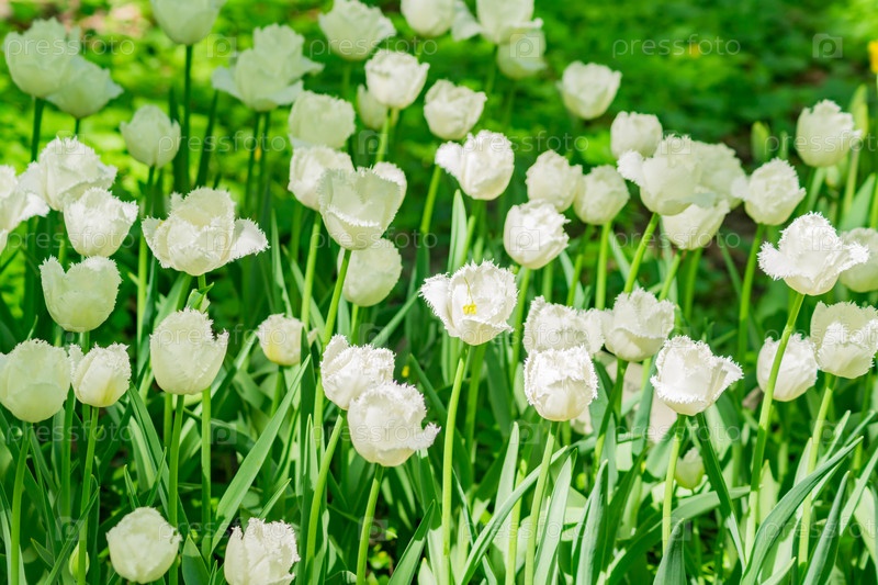 Поле белых тюльпанов. Цветочный фон. Пейзаж летнего сада