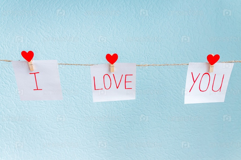 Красные штыри сердца влюбленности валентинки висят на естественном шнуре против голубой предпосылки. Я люблю тебя надпись на кусочках бумаги