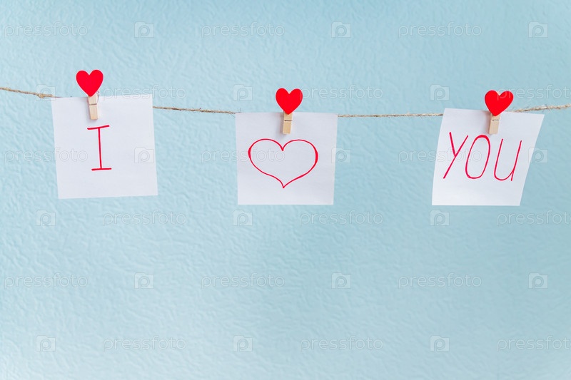 Красные штыри сердца влюбленности валентинки висят на естественном шнуре против голубой предпосылки. Я люблю тебя надпись на кусочках бумаги