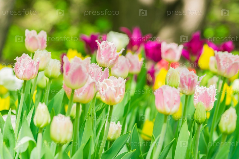 Поле розовых тюльпанов. Цветочный фон. Пейзаж летнего сада. Селективный фокус. Малая глубина резкости
