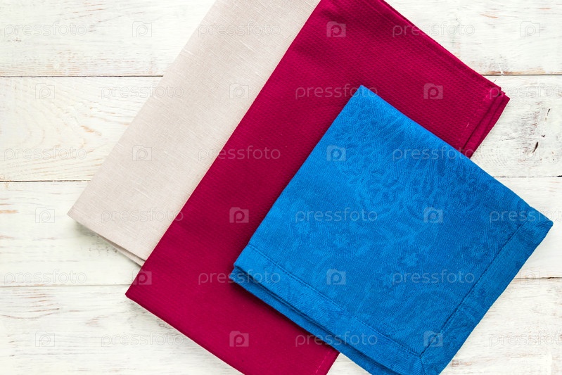 Вид сверху на тканевые салфетки бежевого, синего и бордового цветов на деревенском белом фоне