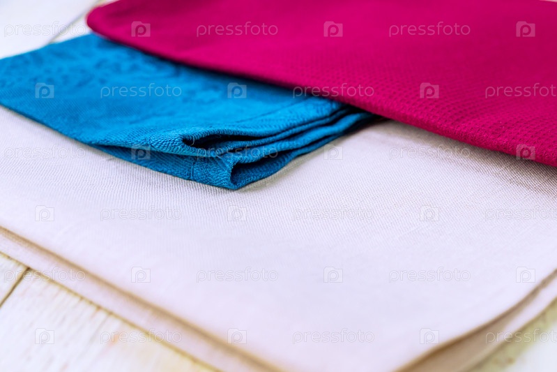 Закройте тканевые салфетки бежевого, синего и бордового цветов на деревенском белом деревянном столе. Малая глубина резкости