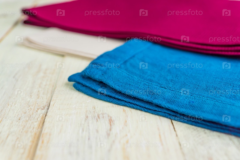 Закройте тканевые салфетки бежевого, синего и бордового цветов на деревенском белом деревянном столе. Малая глубина резкости