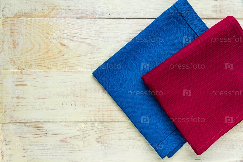 Вид сверху на тканевые салфетки синего и бордового цветов на деревенском белом фоне. Скопируйте место для текста