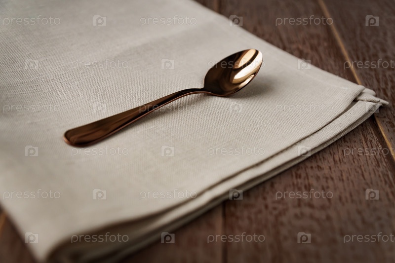 Закройте тканевую салфетку бежевого цвета и подайте чайную ложку на деревянном столе