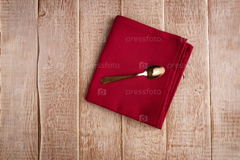Вид сверху на тканевую салфетку бежевого цвета и чайную ложку на деревянном столе